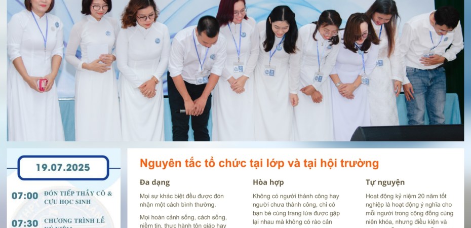– Có quy chuẩn về ứng xử. Sau 20 năm rời trường, mỗi người mỗi cảnh. Có người sẽ vinh quang về trường, cũng có người còn nhiều ngại ngùng về những sự khác biệt của bản thân hay sự tự ti về thành công trong xã hội. Việc ban tổ chức có những quy định, quy chuẩn ứng xử ngay từ đầu sẽ giúp thúc đẩy tính tự giác, đa dạng và hòa hợp của một tập thể đông đảo như thế này. Tôi có đính kèm hình bên dưới là quy chuẩn về ứng xử đã được truyền thông nhiều lần đến các cựu học sinh tham gia buổi lễ cho anh chị bạn tham khảo.